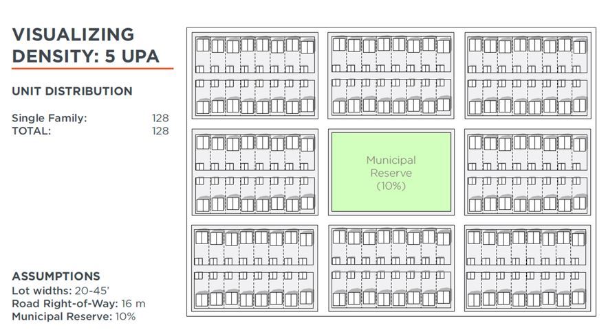 The older part of Town featured large lots, rear laneways, and wide streets, and had a density of approximately 2.5 units per acre. Newer communities such as Willow Ridge and Riverwood achieve a density of approximately 5 units per acre. Smaller lots, and multi-family housing are the reason for the increased density.